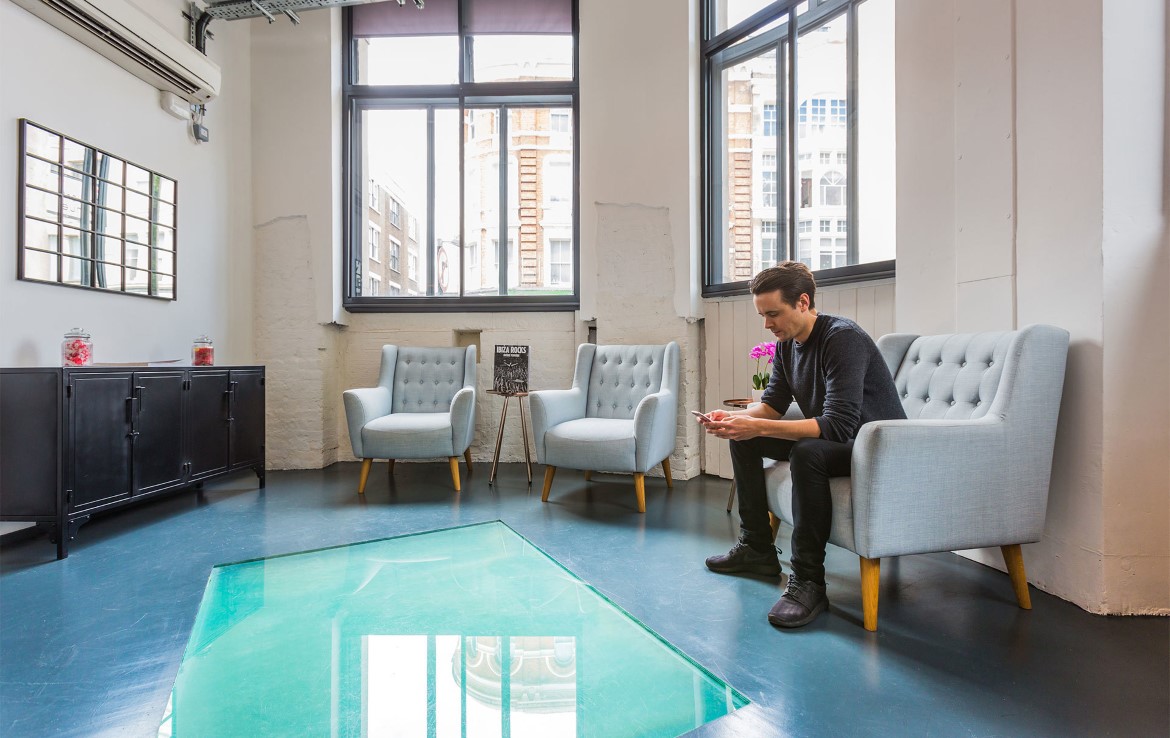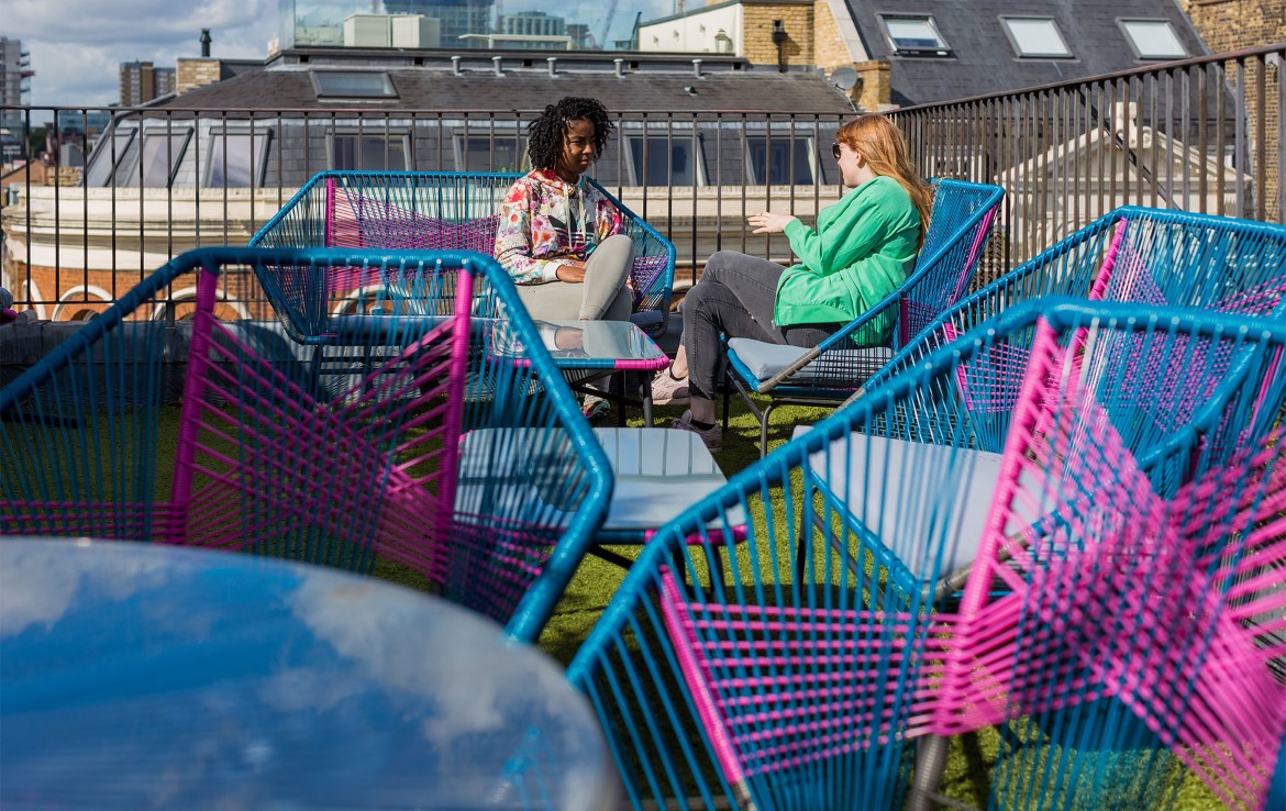 Previously a bank and a nightclub, the building revels in high ceilings and wooden floors and fuses professional work spaces with social hubs, including a roof terrace with a striking urban vista.