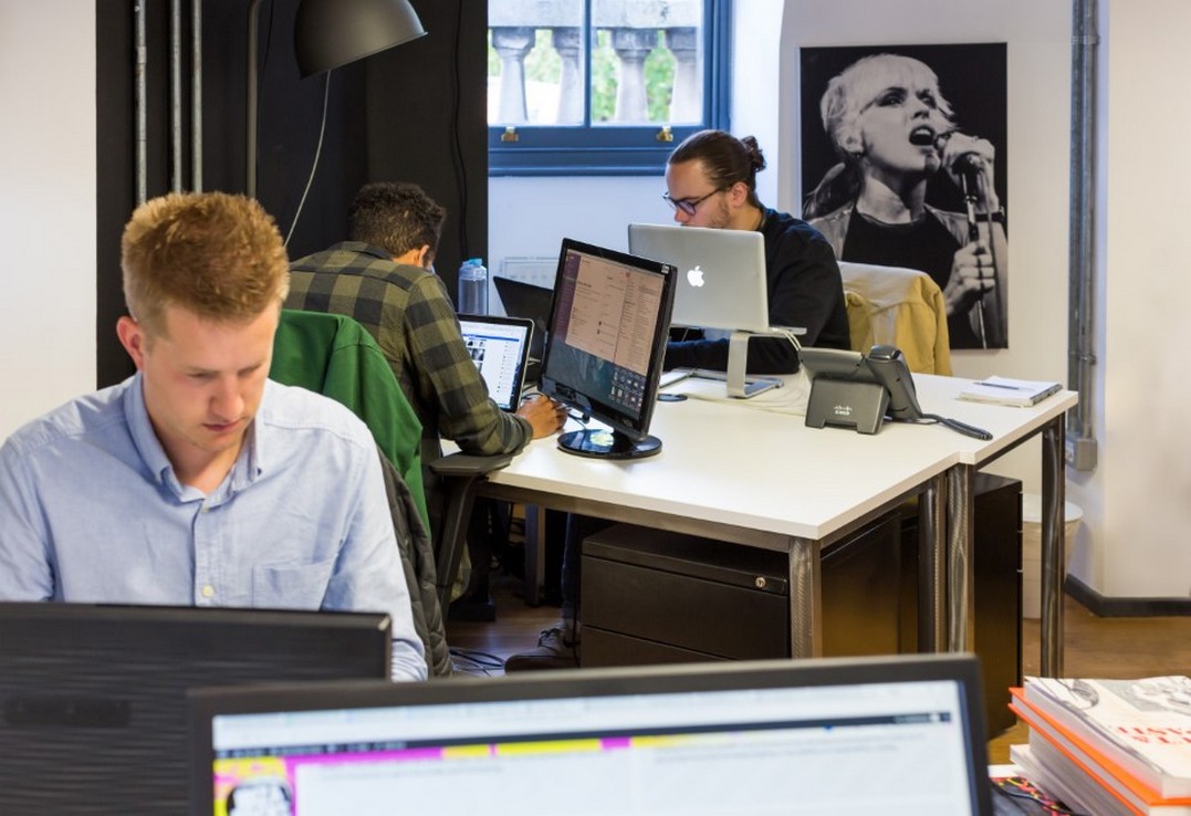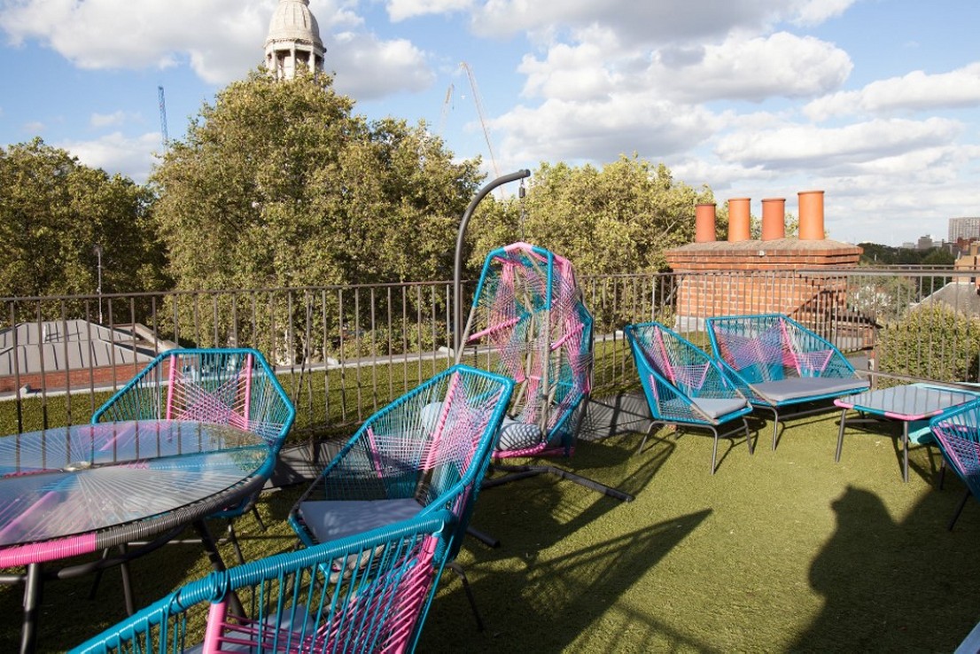 Previously a bank and a nightclub, the building revels in high ceilings and wooden floors and fuses professional work spaces with social hubs, including a roof terrace with a striking urban vista.