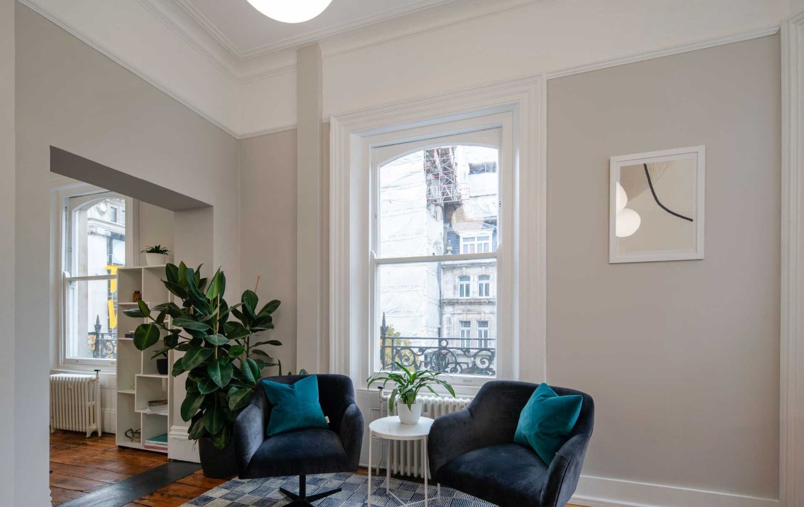 A beautifully converted Mayfair office building with bright, spacious private offices in the heart of London’s West End. Stunning period features meet with elegant design to create a welcoming and sophisticated office environment.