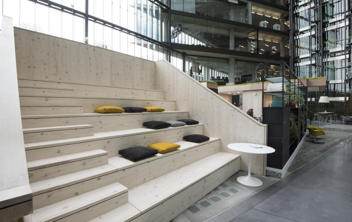 The Atrium is a one-of-a-kind studio-style workspace at the heart of an 11-storey glass atrium. A flexible, open-plan timber workspace flooded with natural light. The space is cleverly designed to create different working zones and breakout spaces without conventional walls or ceilings. There are private rooms for meetings, phone calls or quiet work – as well as private phone booths, shared breakout spaces, a kitchenette and even a mini-amphitheatre for team briefings and talks.